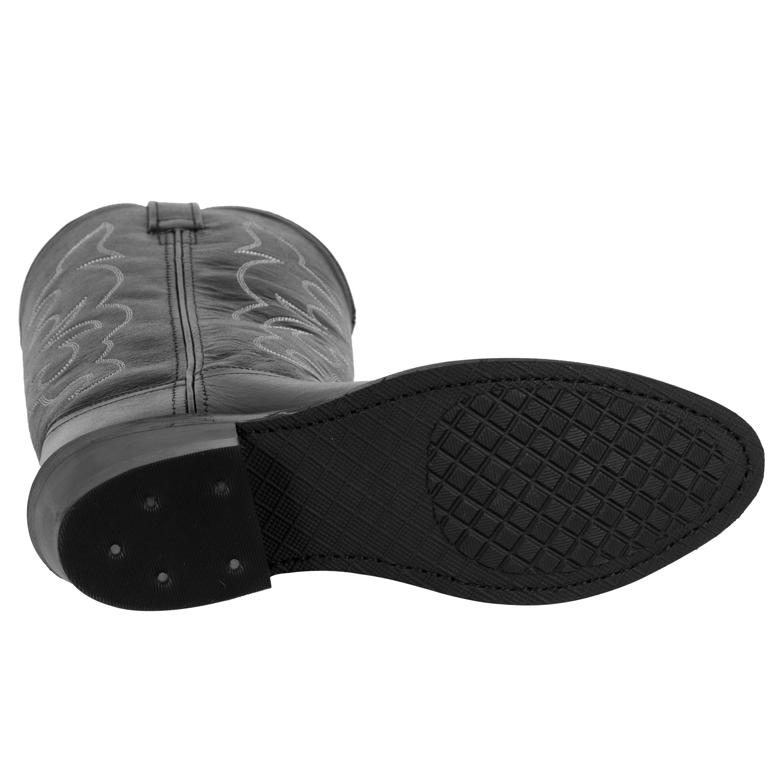 • 13" Shaft These authentic western black leather mens cowboy boots from Old West feature a narrow round toe, cowboy heel, and tough work outsole. Constructed from high quality leather and man-made materials, these boots are made to last. For a traditional western look with style, these boots are the perfect choice.