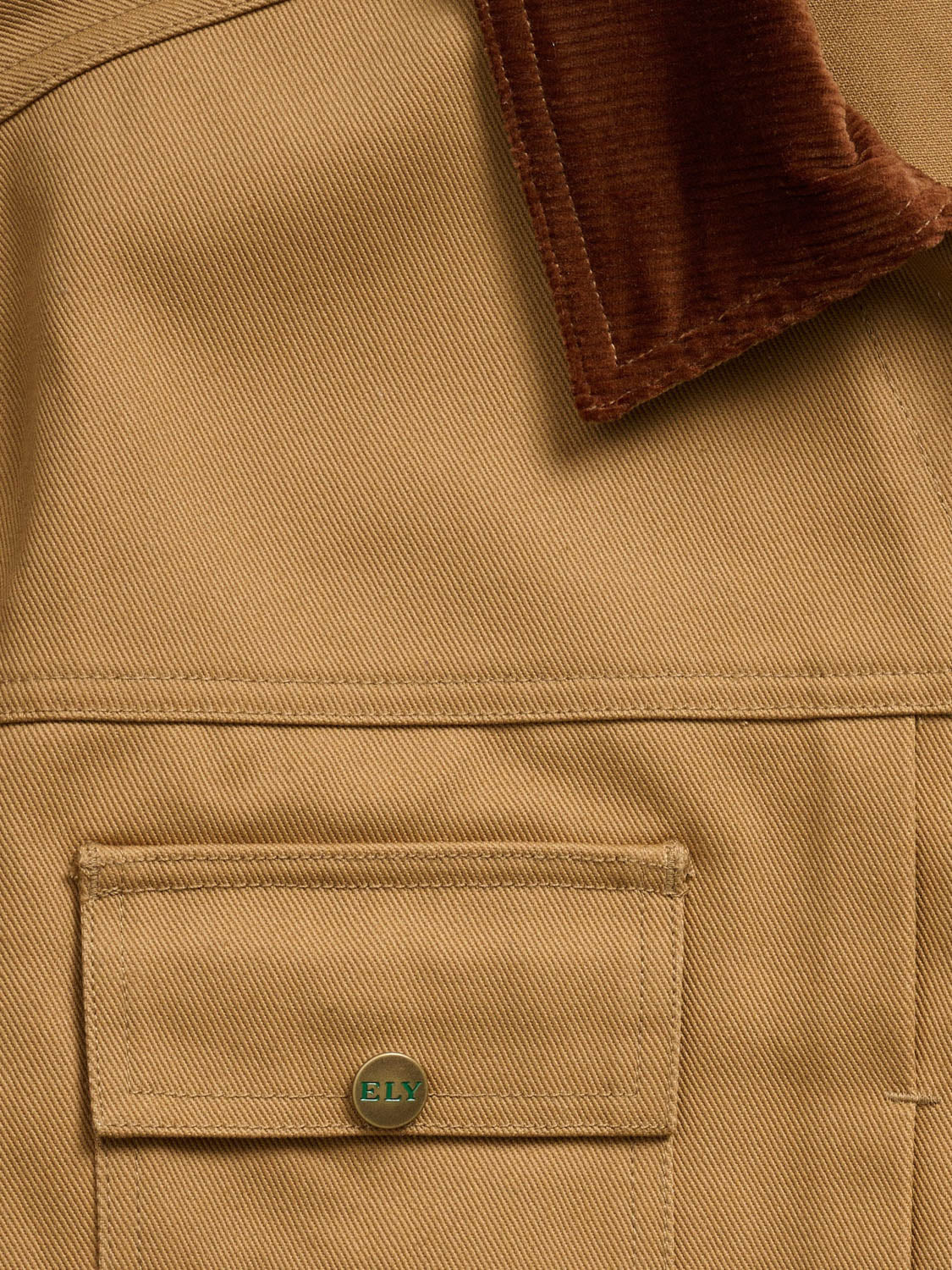 • 100% Cotton 14oz Twill Since 1878, Ely & Walker has been on a mission to deliver the highest quality product to value-conscious consumers like yourself. Inspired by our 1970's Reissue Denim Jacket, this tan twill version will become another staple in your wardrobe. Built on the same body as our vintage denim jacket, but with a rugged color update and this one features a rich brown corduroy collar. The weight of the twill is heavy enough to keep the chill off and still light enough to move with you through any season. From the ranch and beyond, stay layered in style in this jacket.