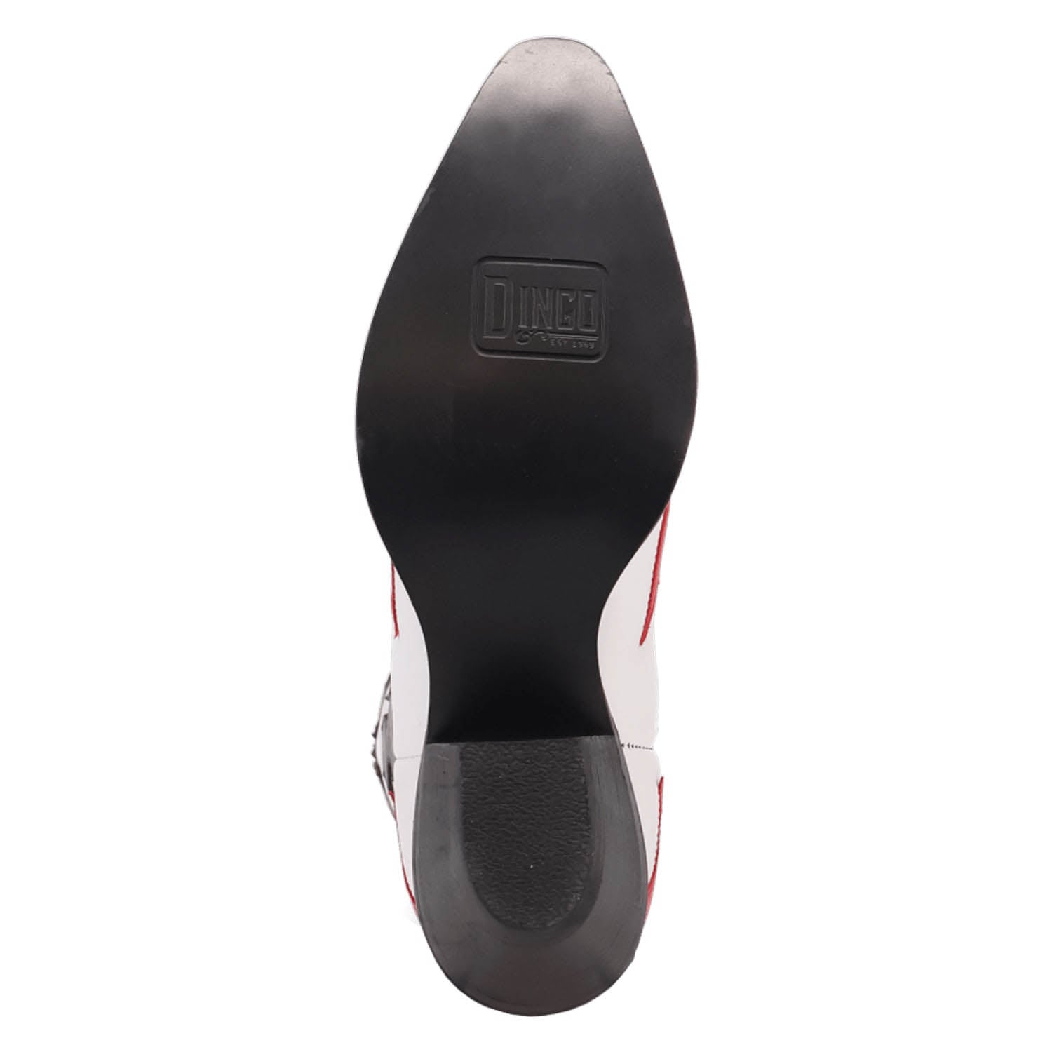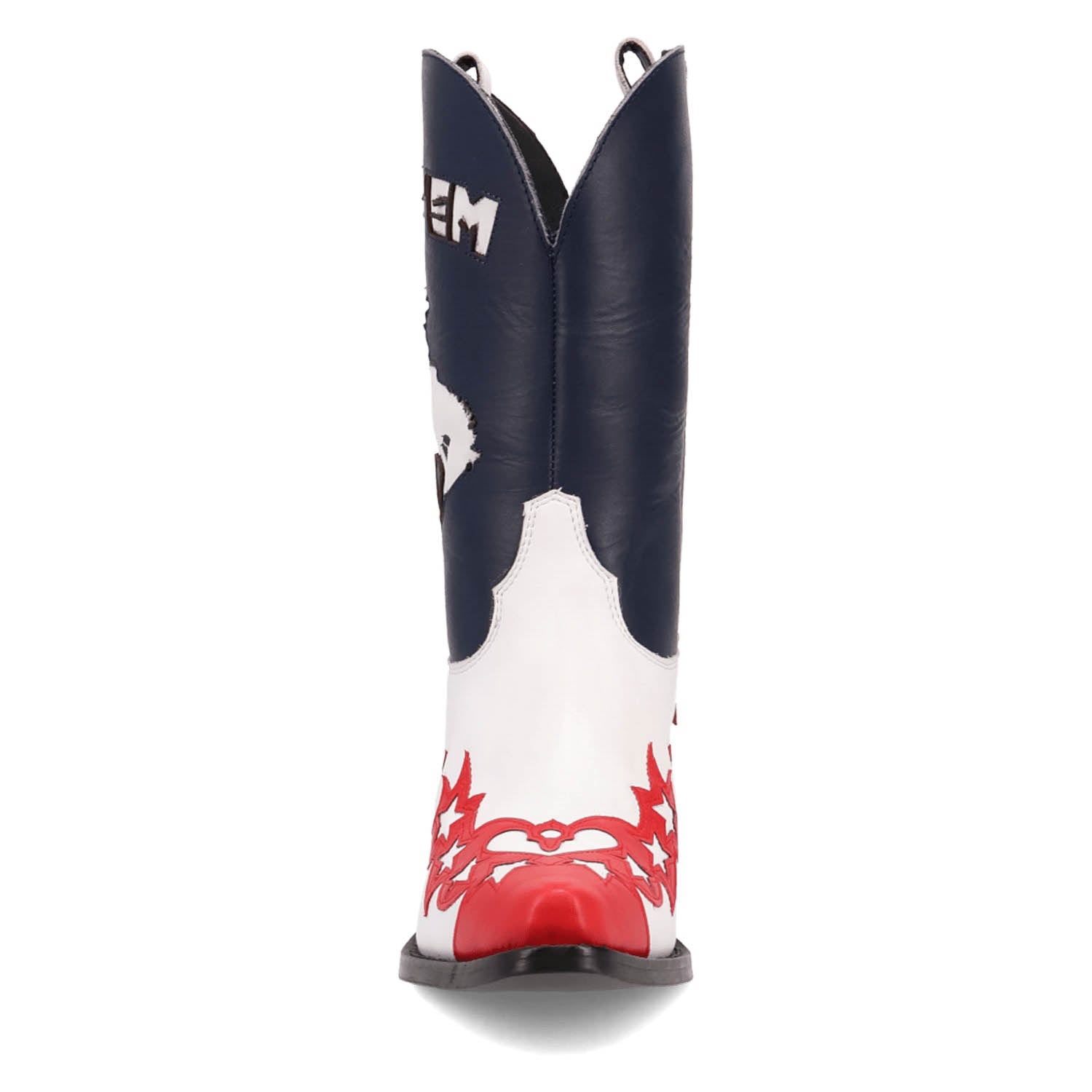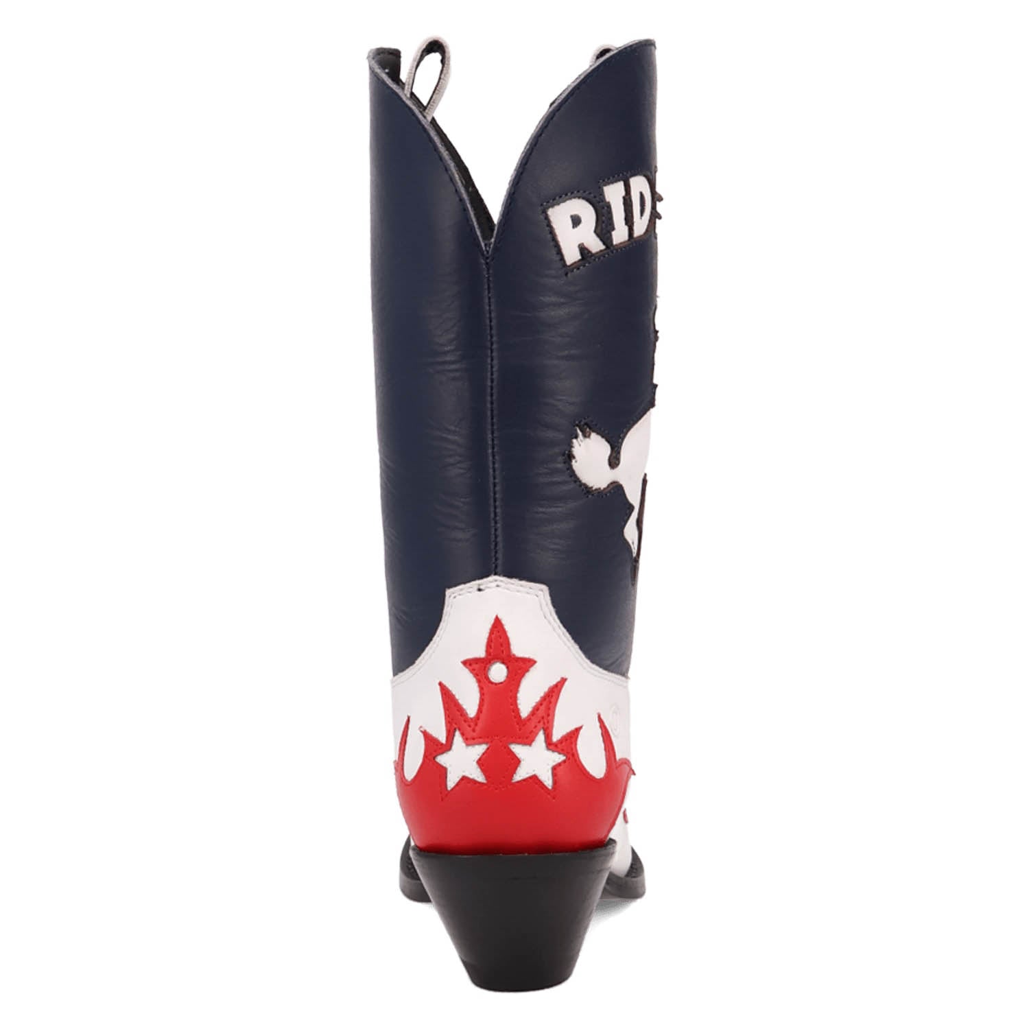 • Leather materials Blending the past and the present, Dingo boots stand out in the crowd. Find your freedom with these stylish boots. The captivating red, white, and blue design with stars, evokes a sense of independence and a touch of the iconic 'Ride 'Em Cowgirl' spirit. Wear these cowboy boots with pride!