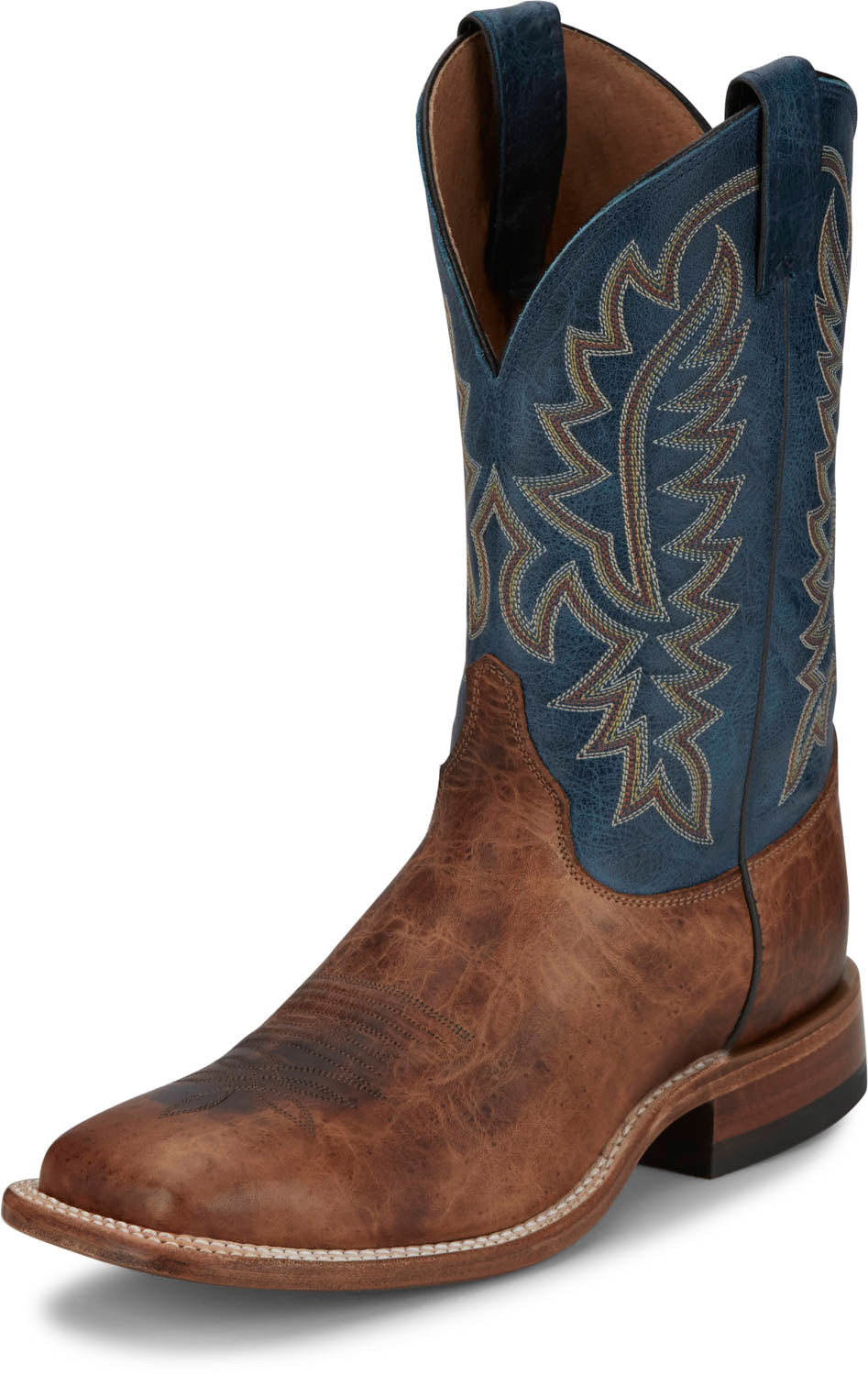 Justin Mens Poston 11in Western Amber/Blue Leather Bent Rail Cowboy Boots