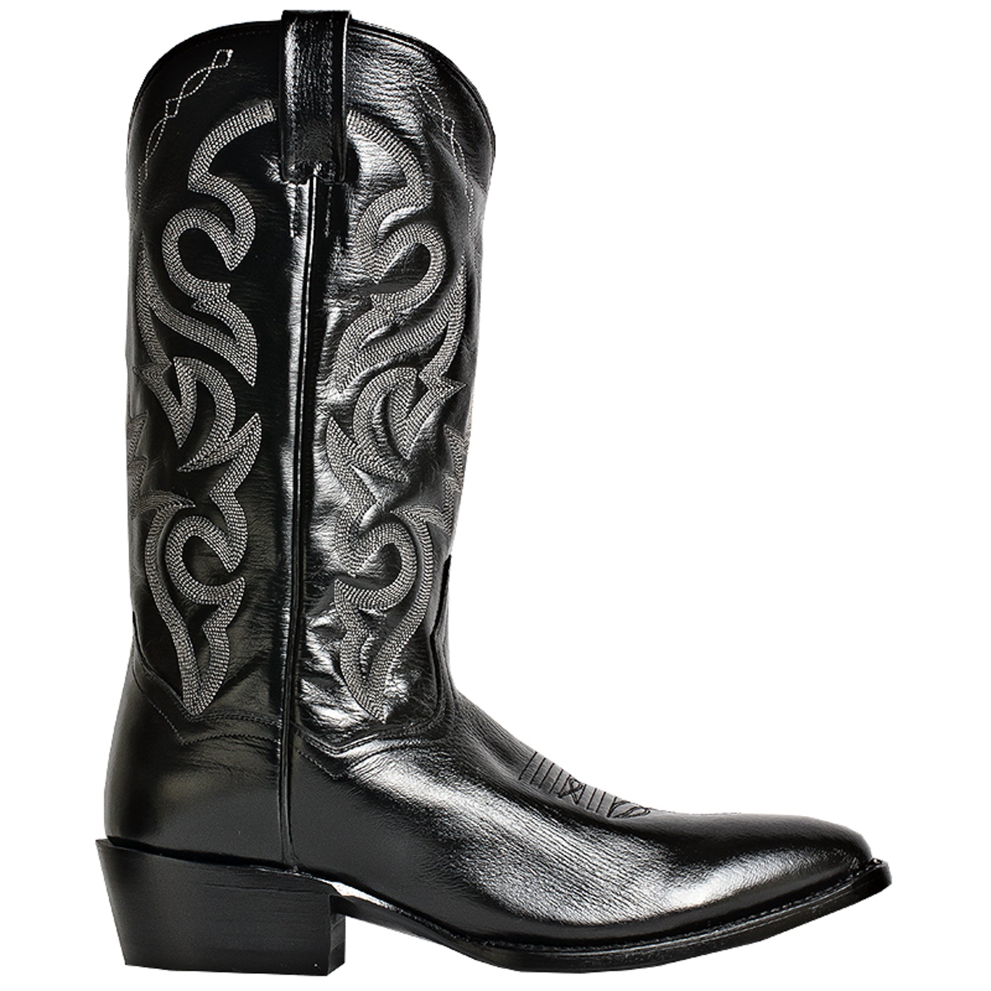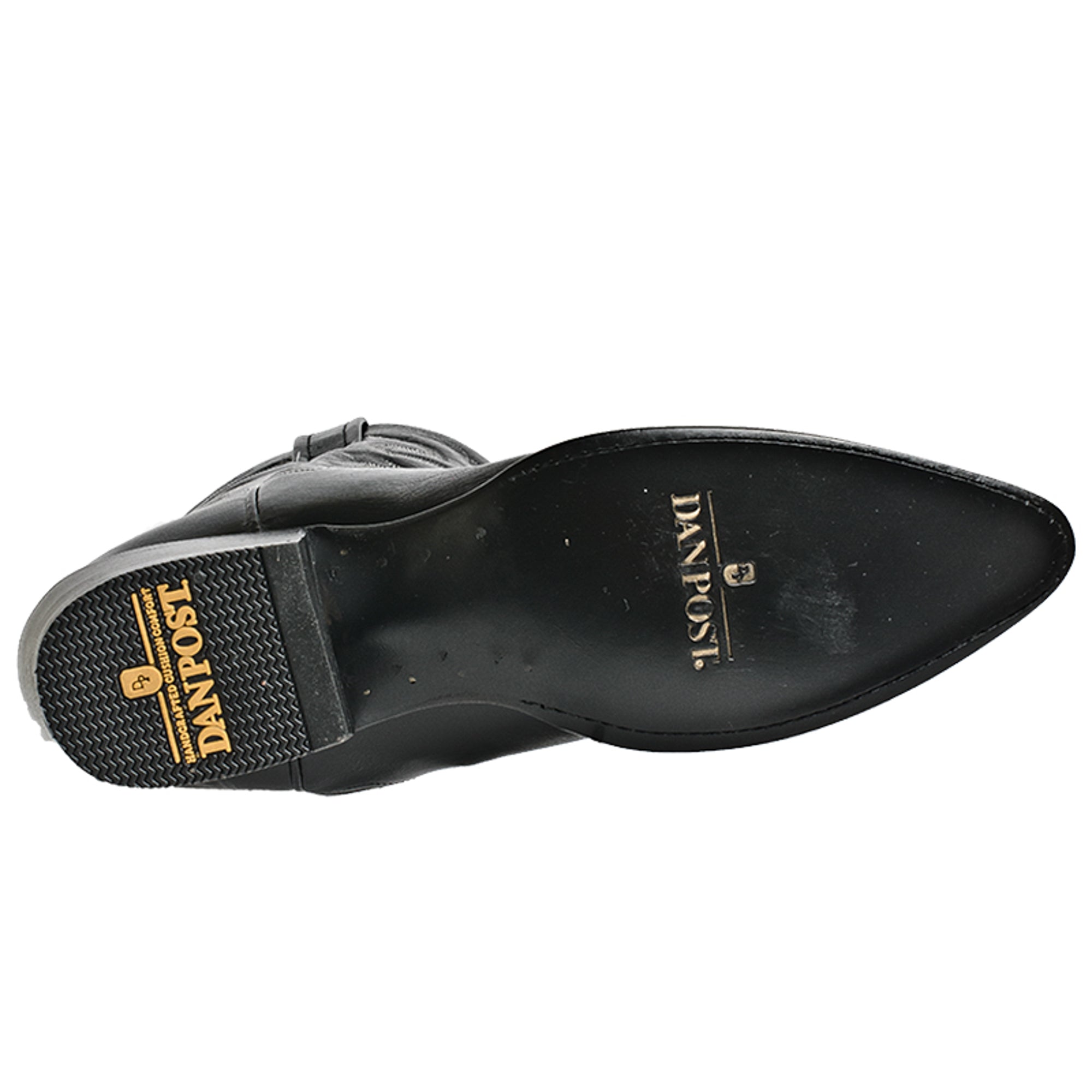 These authentic handmade black leather mens cowboy boots from Dan Post feature a leather, leather outsole, and j toe. Made with only premium materials and the signature Dan Post Handcrafted Cushion Comfort design, these boots are a true western classic.