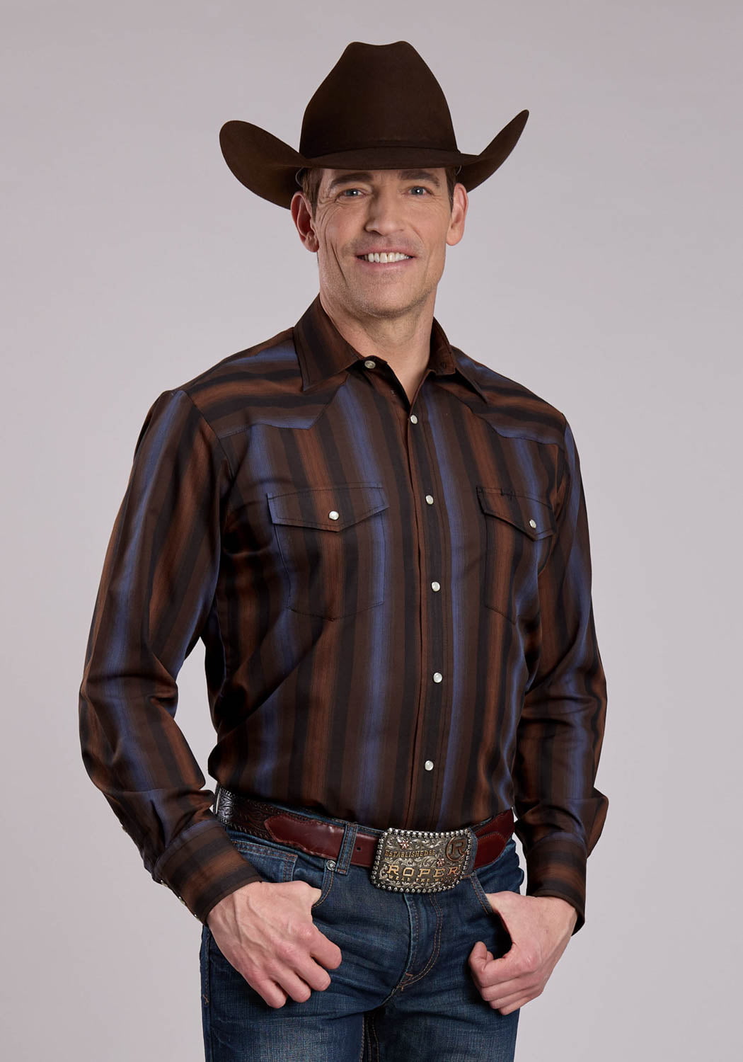 Roper Mens Wide Stripes Brown/Blue Cotton Blend L/S Shirt
