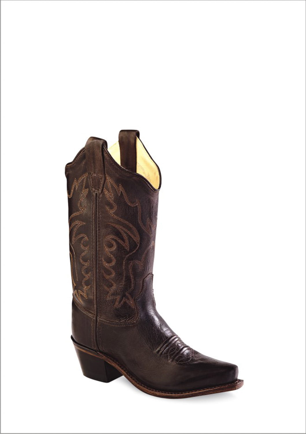 • Brown Canyon Leather These stylish boys leather cowboy boots from Old West feature a snip toe, 8" scallop shaft, and leather outsole. Constructed from high quality leather and man-made materials, these boots are durable enough for everyday wear. Your little cowboy will love toying around in these western style boots.
