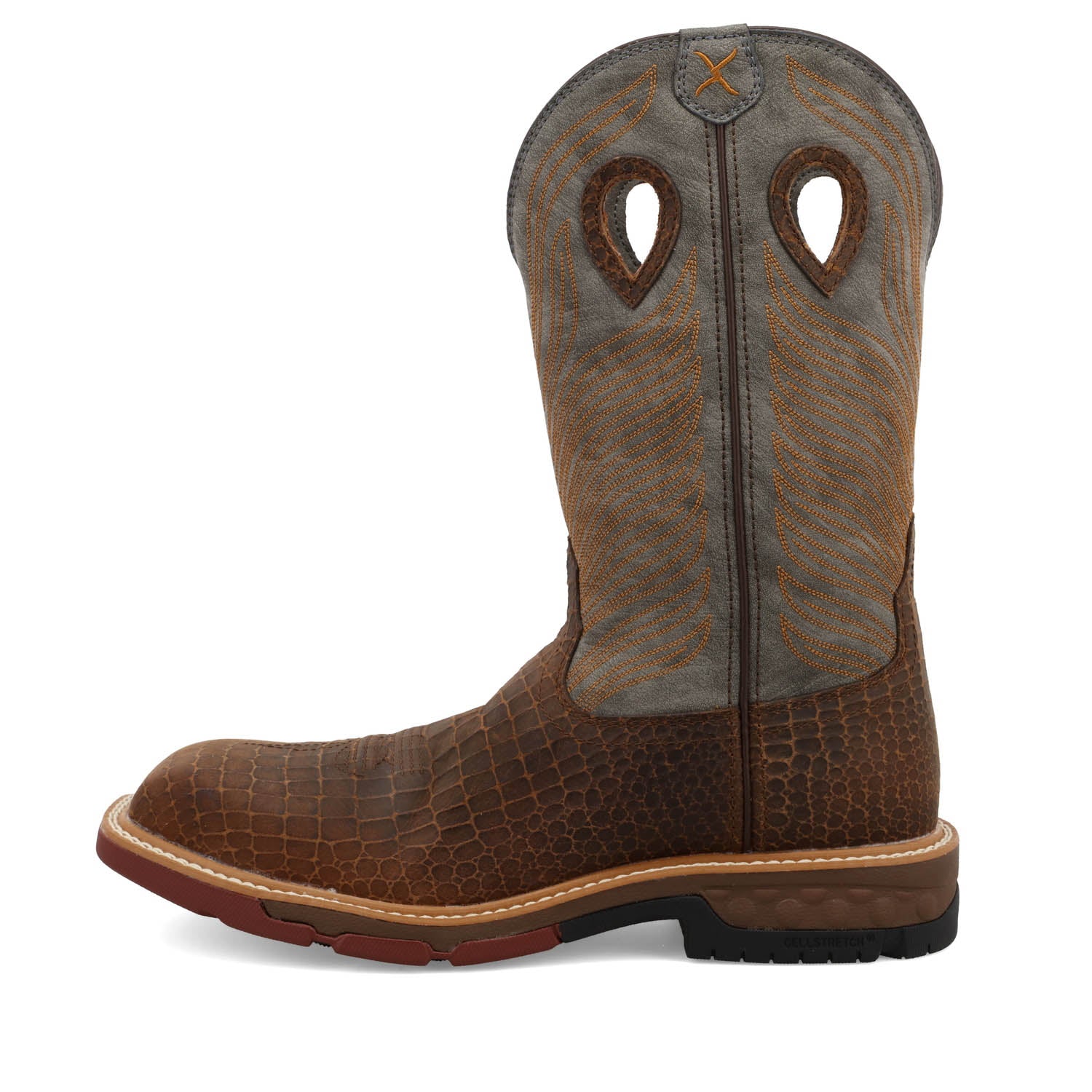 Always striving, never compromising. Twisted X is dedicated to making better boots and it shows. This Mens 12" Nano Composite Safety Toe Western Work Boot was built for all day comfort. Handcrafted with a full-grain leather caiman print vamp and leatherTWX upper, this boot features a Nano Composite Safety Toe and traditional western profile. These work boots also feature Twisted X CellStretch comfort technology, ensuring that every step you take is backed with cloud-like comfort. In addition, this improved construction reduces the weight of previous Twisted X Western Work boot styles by 15%. Stability and durability are essential to a quality work boot and these boots deliver! These boots combine a compression-molded sugar cane molasses EVA midsole and a nylon/glass fiber shank for proper support. The Electrical Hazard rated oil and slip resistant outsole provides added durability and improved traction for whatever your day may bring. Work hard and stay protected with these work boots.