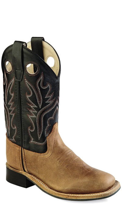 • Light Brown Foot, Black Shaft These stylish boys light brown leather cowboy boots from Old West feature a broad square toe, white double row welt stitch, and rubber outsole. Constructed from high quality leather and man-made materials, these boots are durable enough for everyday wear. Your little cowboy will love toying around in these western style boots.