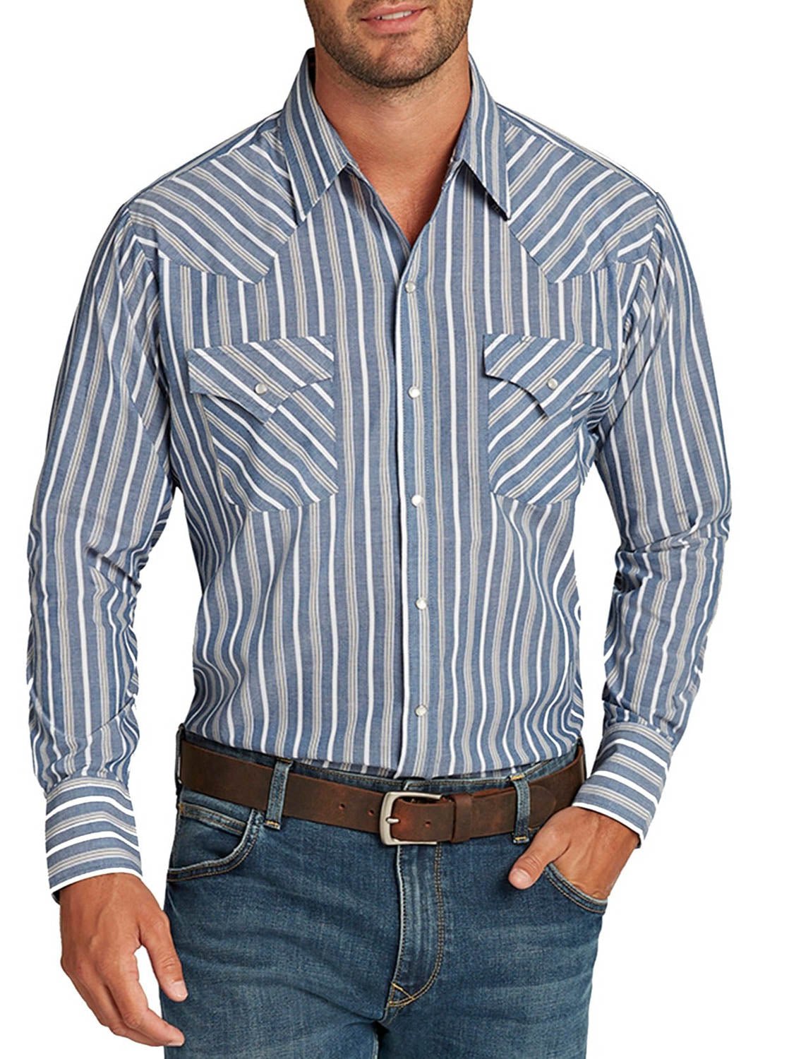 Ely and Walker Mens Stripe Western Snap Blue Poly/Cotton L/S Shirt