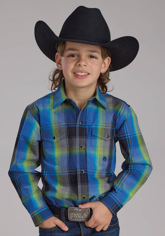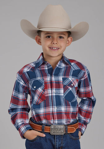Roper Kids Boys 2484 Western Plaid Navy/Light Blue Cotton Blend L/S Shirt