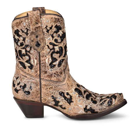 Corral Womens Glitter Inlay Floral Overlay Brown/Black Cowhide 8in Cowboy Boots