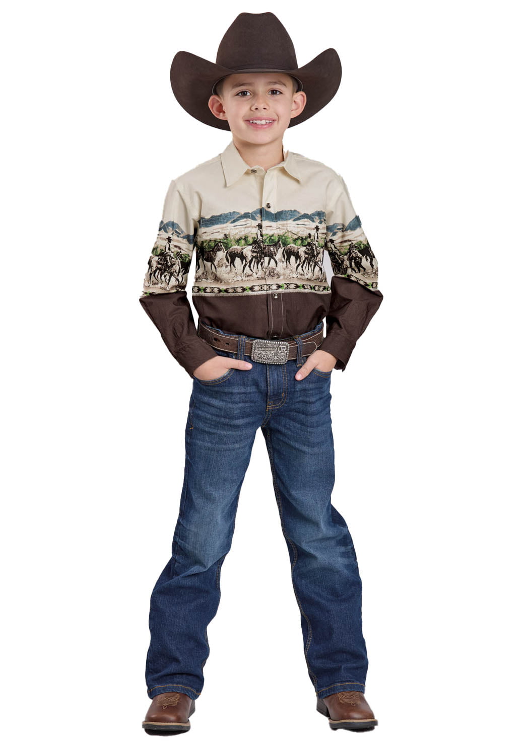 Roper Kids Boys Country Trails Border Brown 100% Cotton L/S Shirt