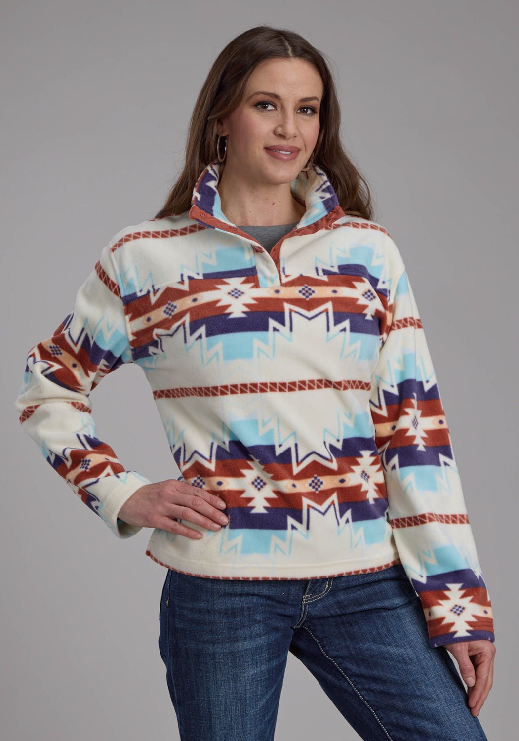 Roper Womens Large Aztec Print Cream/Blue 100% Polyester Fleece Jacket