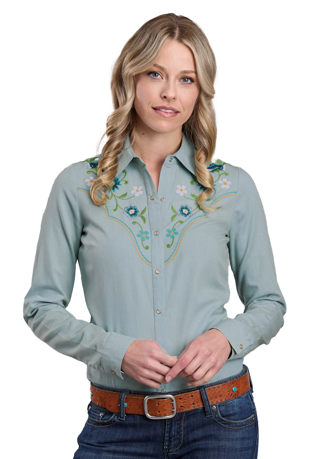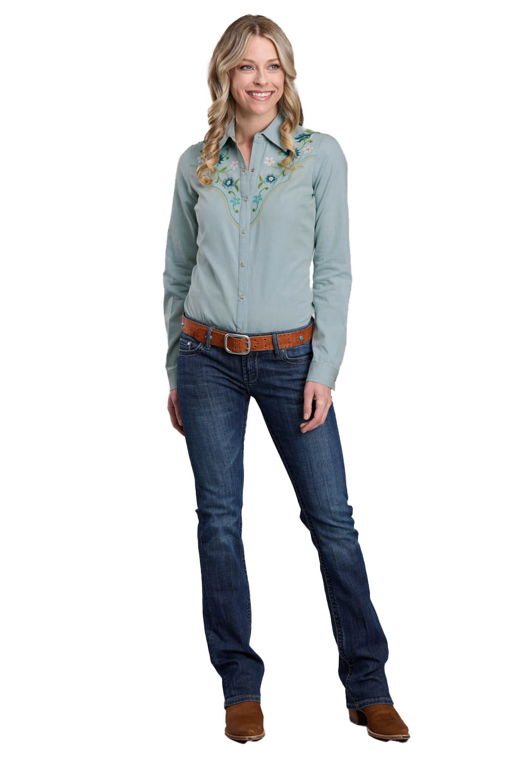 Roper Womens 2668 Floral Embroidery Light Blue 100% Cotton L/S Shirt