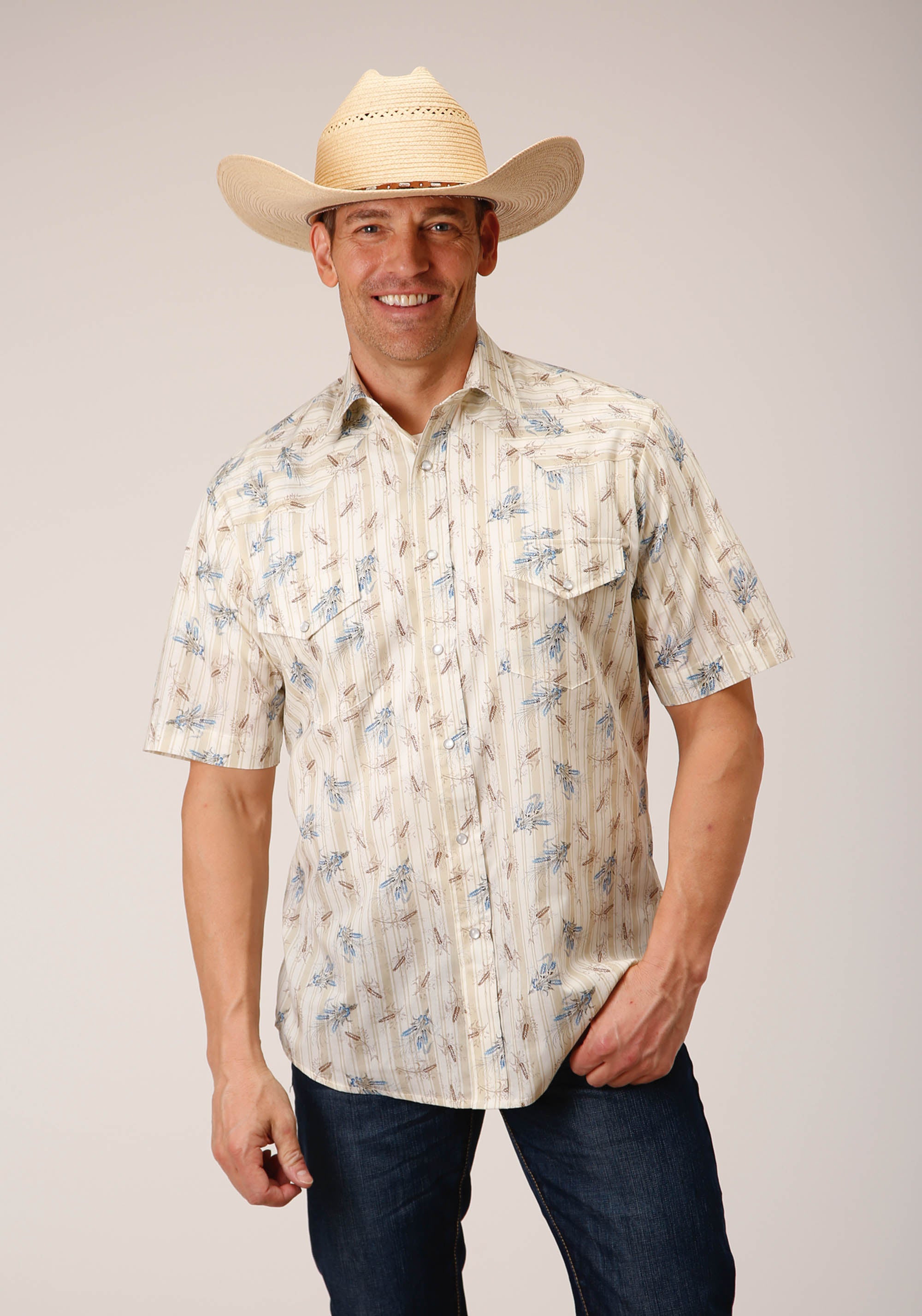 Roper Mens Vintage Wheat Print Tan Cotton Blend S/S Shirt