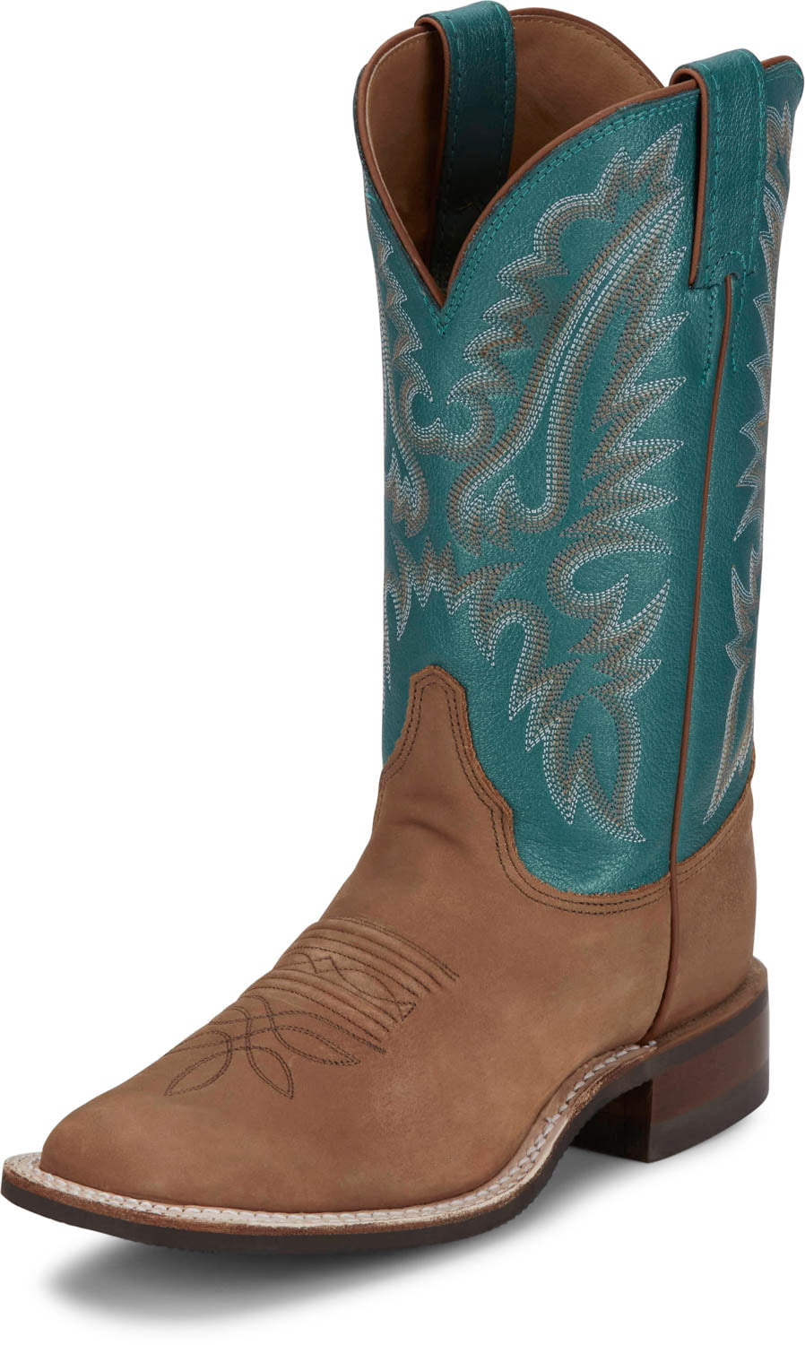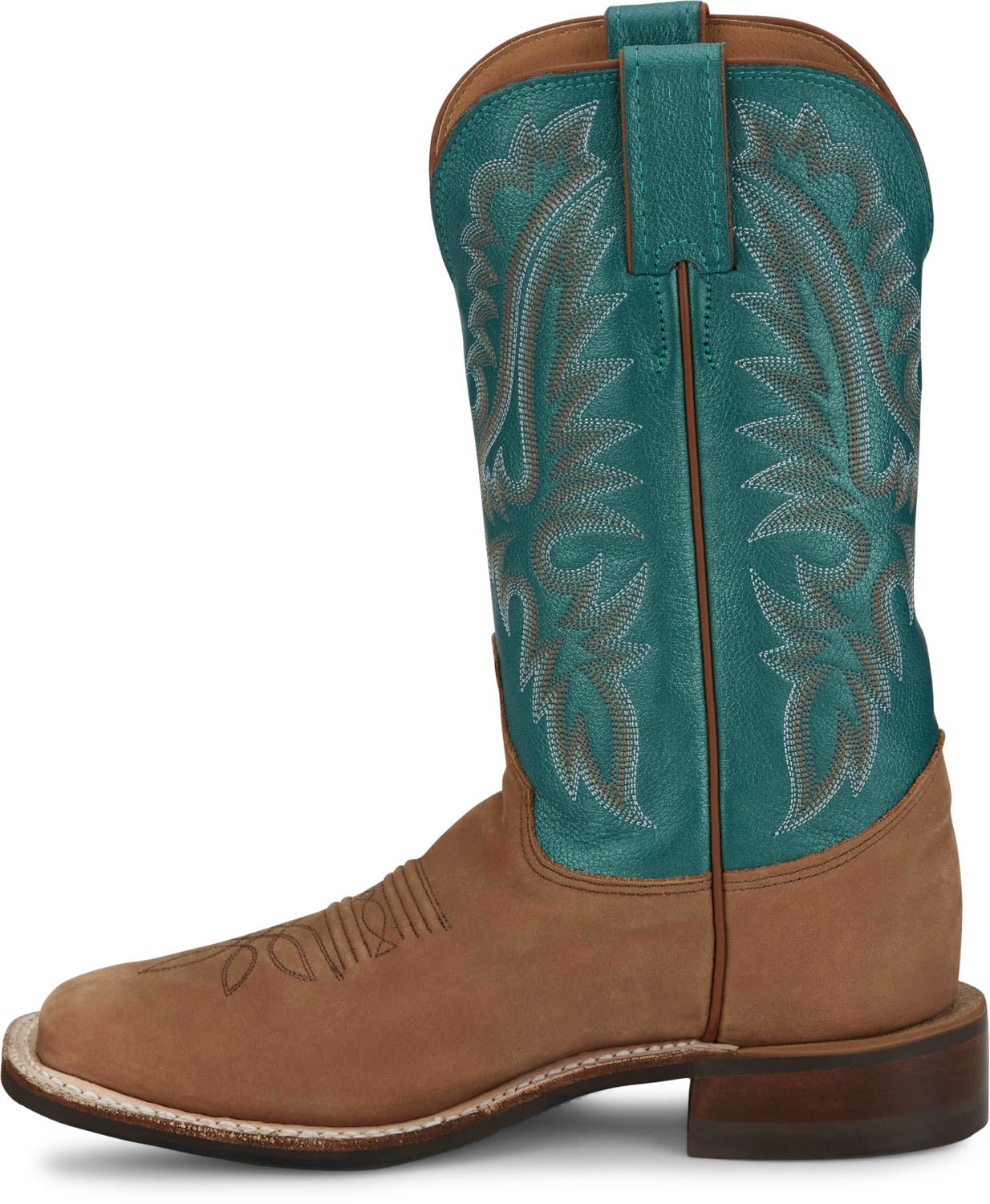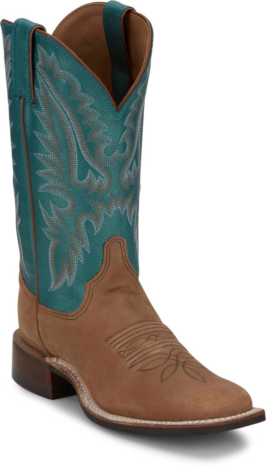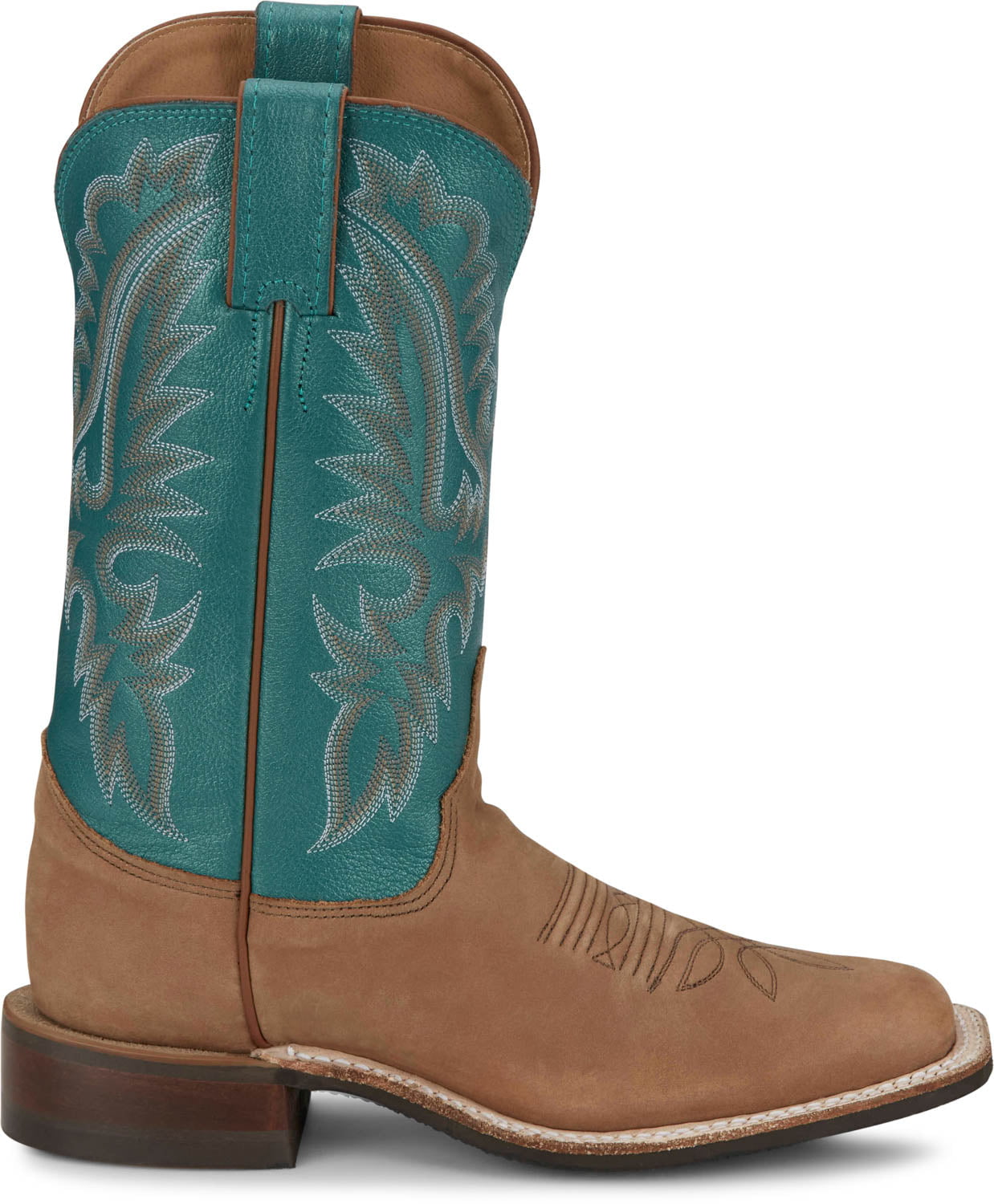 Justin Womens Shay 11in Western Tan/Turquoise Leather Bent Rail Cowboy Boots