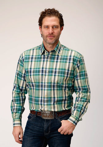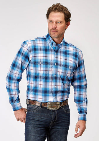 Roper Mens Open Range Border Blue/White 100% Cotton L/S Shirt