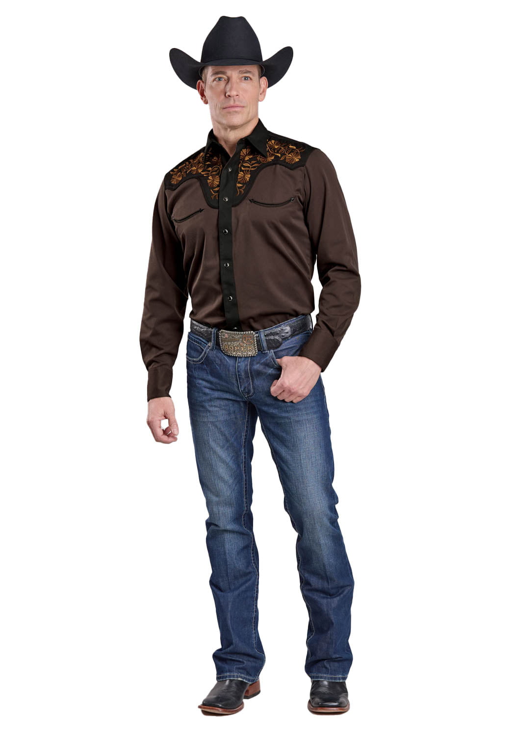 Roper Mens Floral Fancy Yokes Chocolate Poly/Rayon L/S Shirt