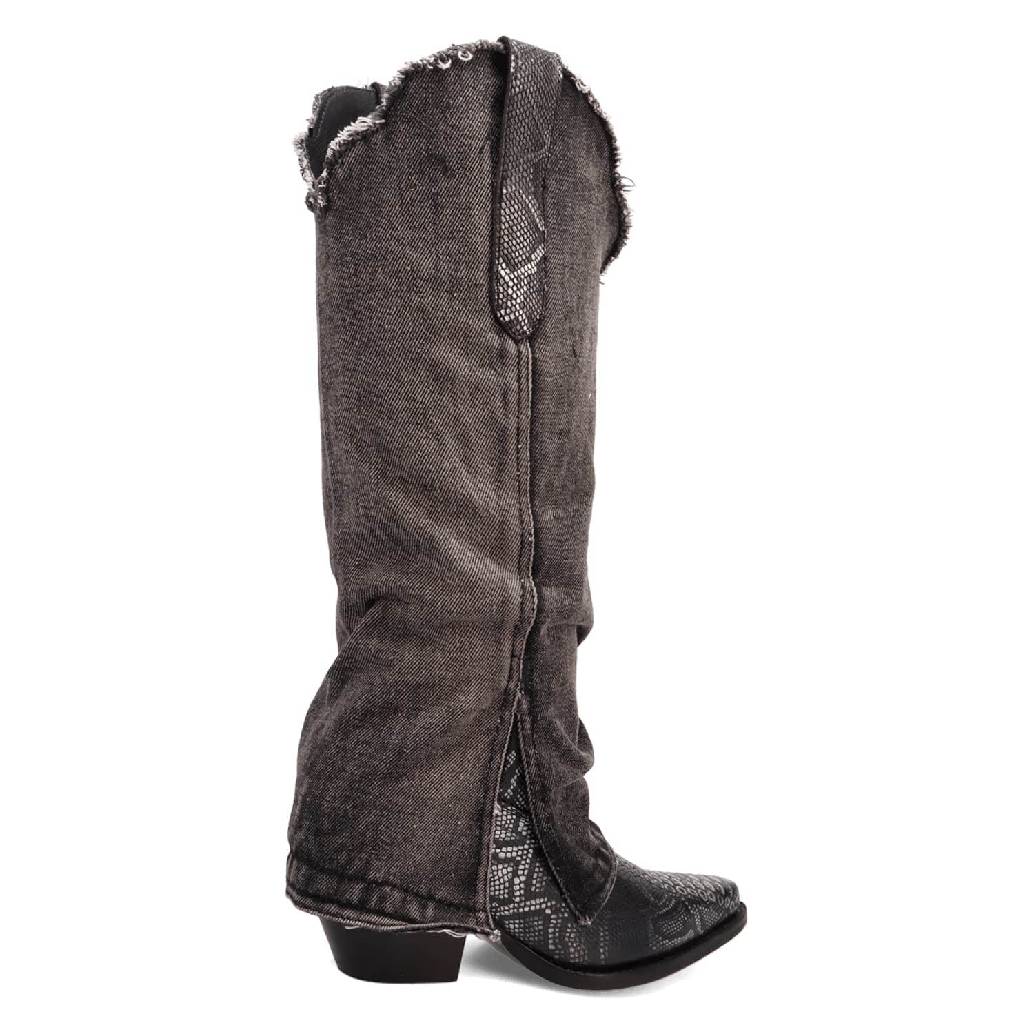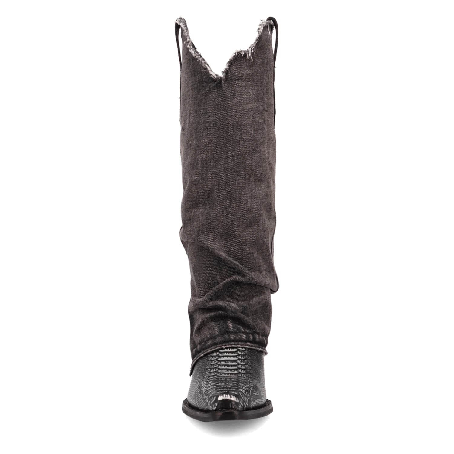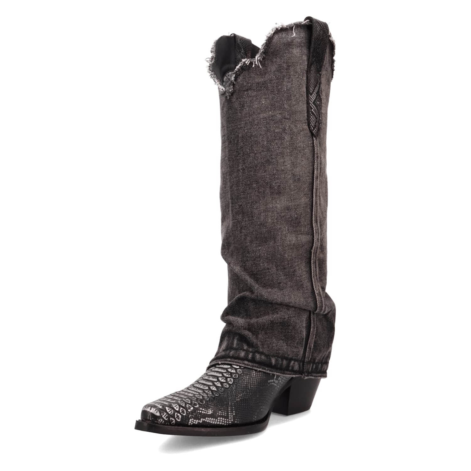 • Leather foot with denim fold over materials Blending the past and the present, Dingo boots stand out in the crowd. Capture attention with the fashion-forward Shabby leather boot that is sure to turn heads from Dingo1969. Featuring a captivating lizard print design along both the vamp and the straps for an exotic touch. Elevating the style further, a denim fold over design on the shaft imparts a luxurious and fierce look to the boot. Standing tall at 16 inches, it features a sleek snip toe and a 2 1/2-inch heel for an elegant silhouette. Wear these cowboy boots with pride!