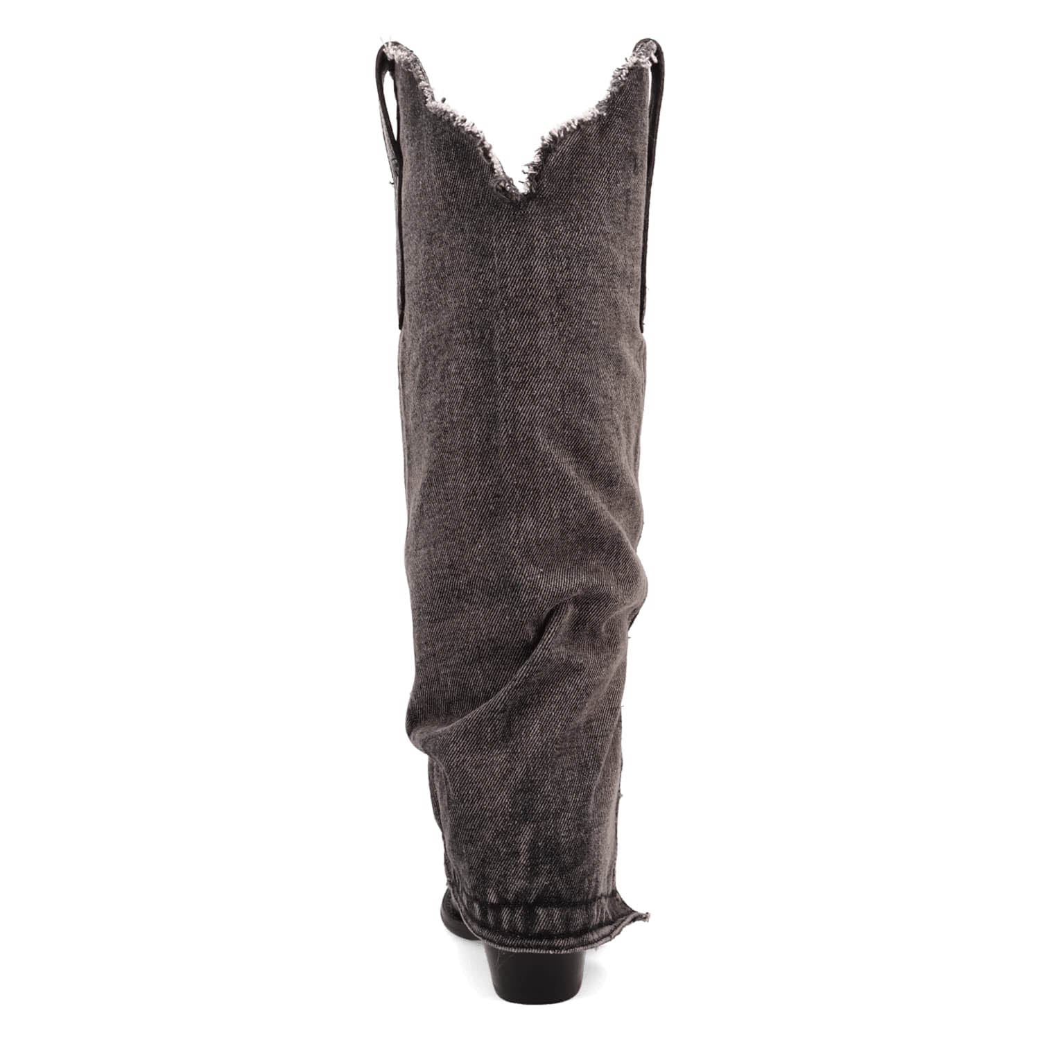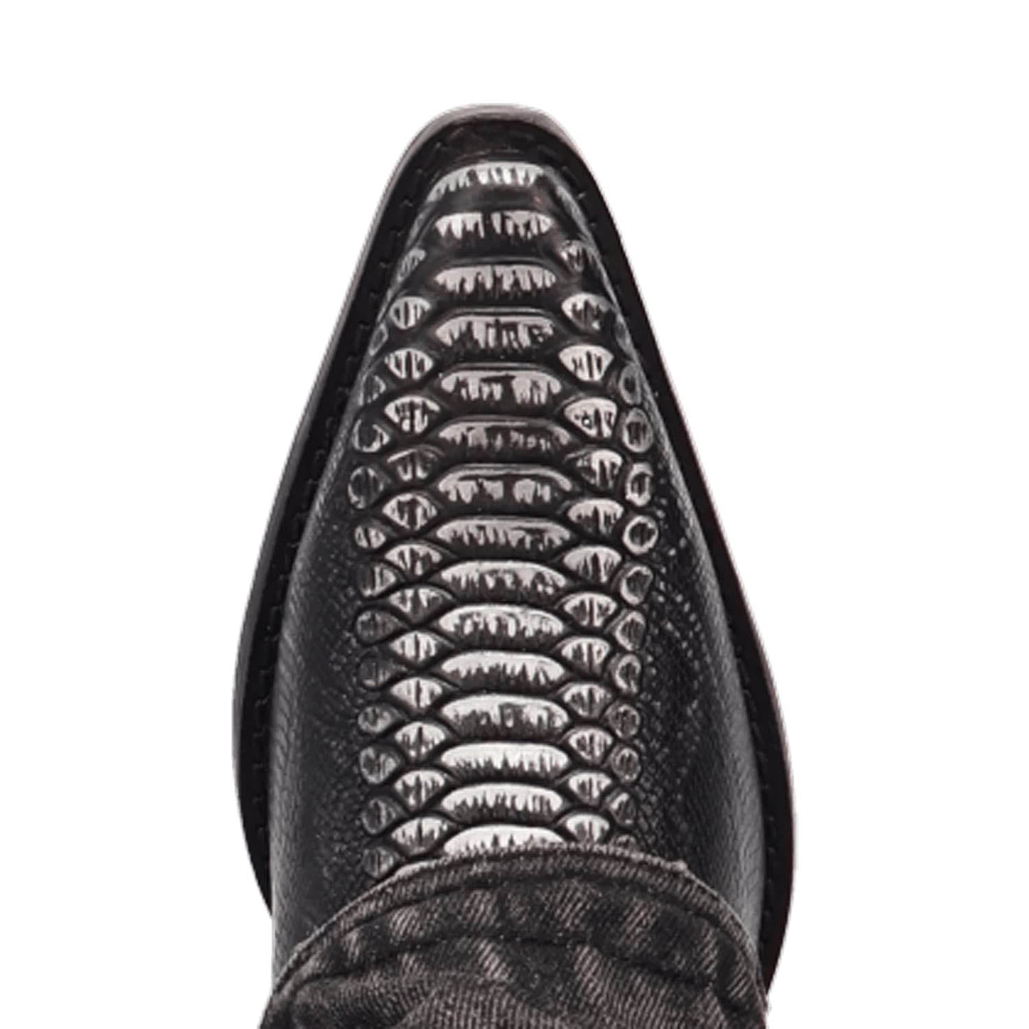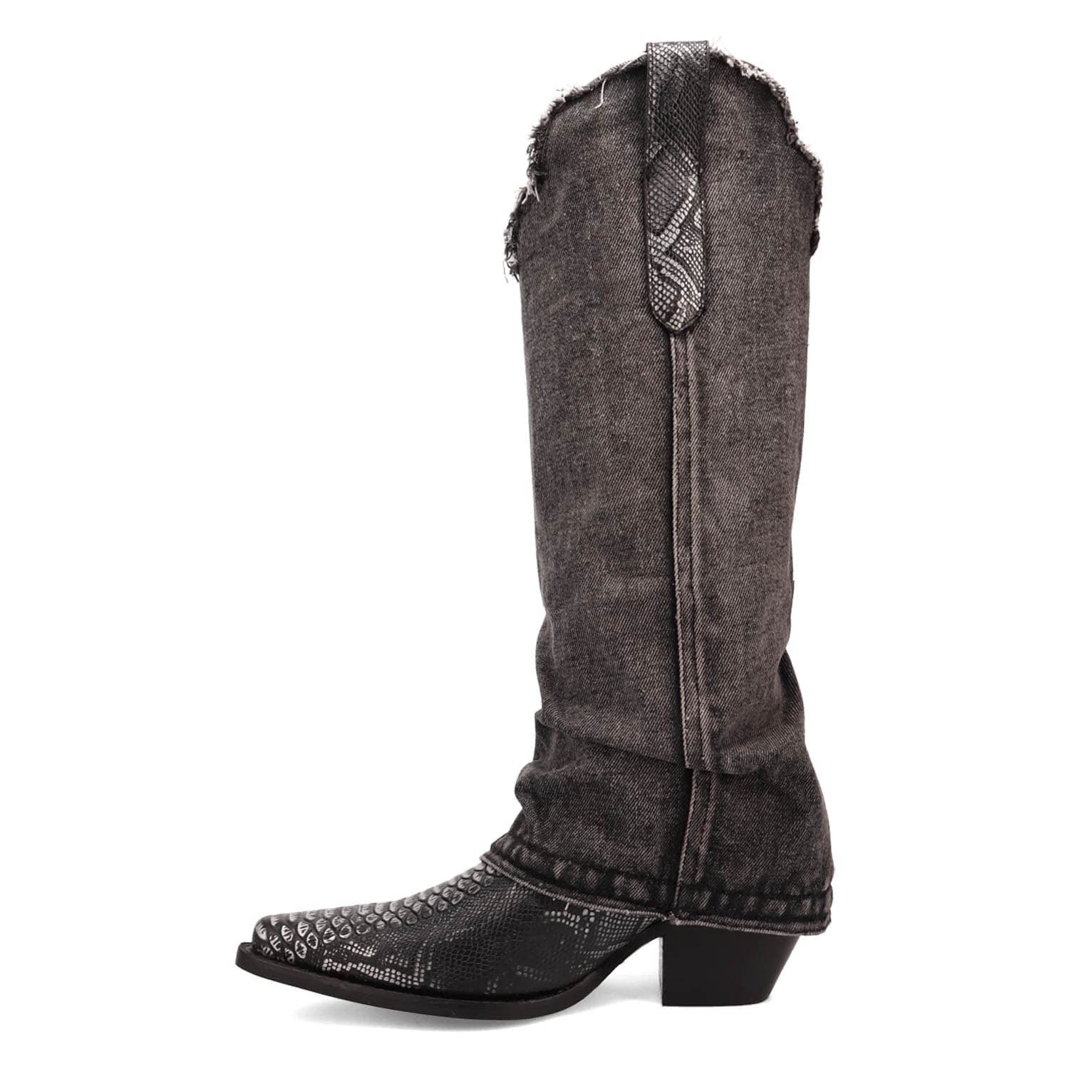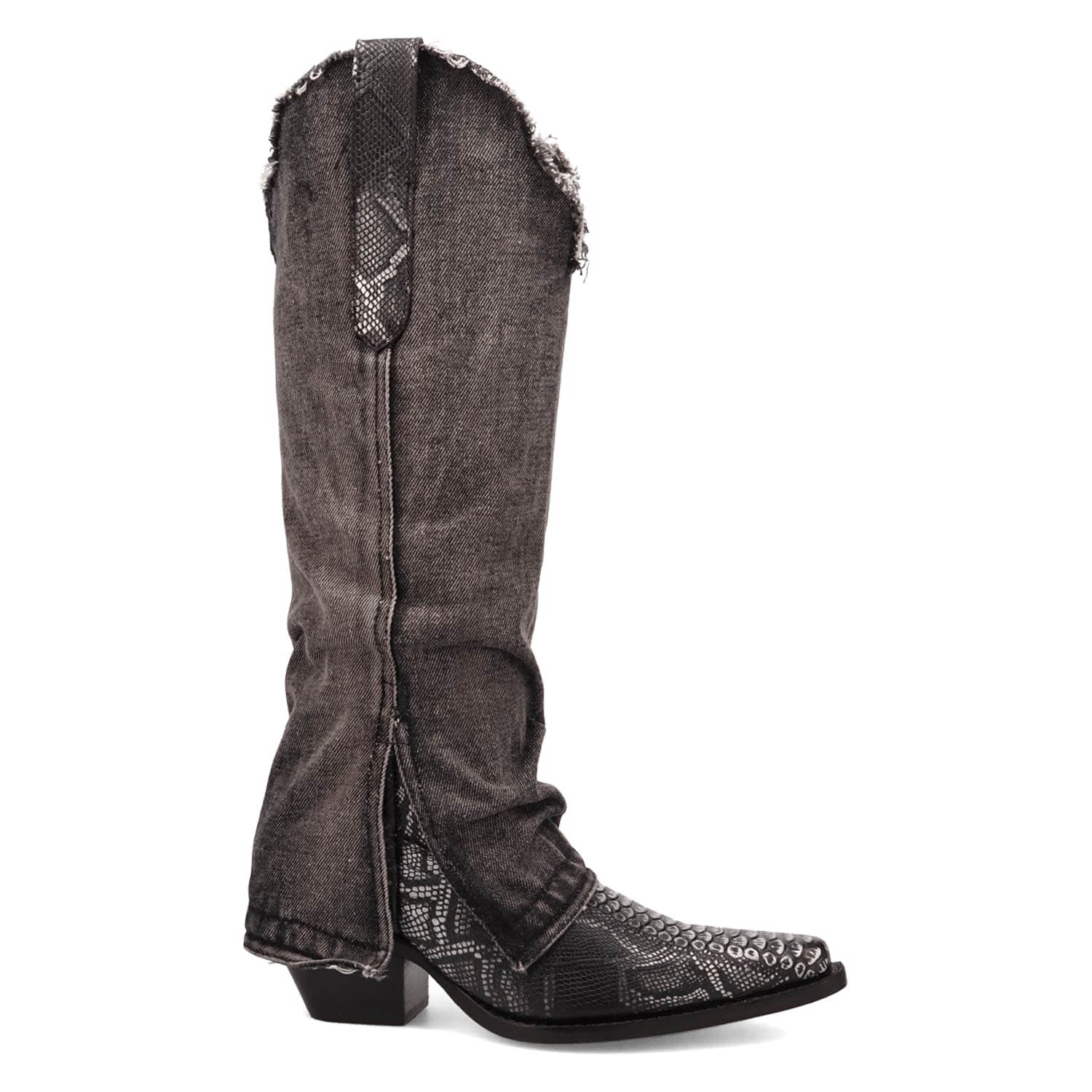 • Leather foot with denim fold over materials Blending the past and the present, Dingo boots stand out in the crowd. Capture attention with the fashion-forward Shabby leather boot that is sure to turn heads from Dingo1969. Featuring a captivating lizard print design along both the vamp and the straps for an exotic touch. Elevating the style further, a denim fold over design on the shaft imparts a luxurious and fierce look to the boot. Standing tall at 16 inches, it features a sleek snip toe and a 2 1/2-inch heel for an elegant silhouette. Wear these cowboy boots with pride!