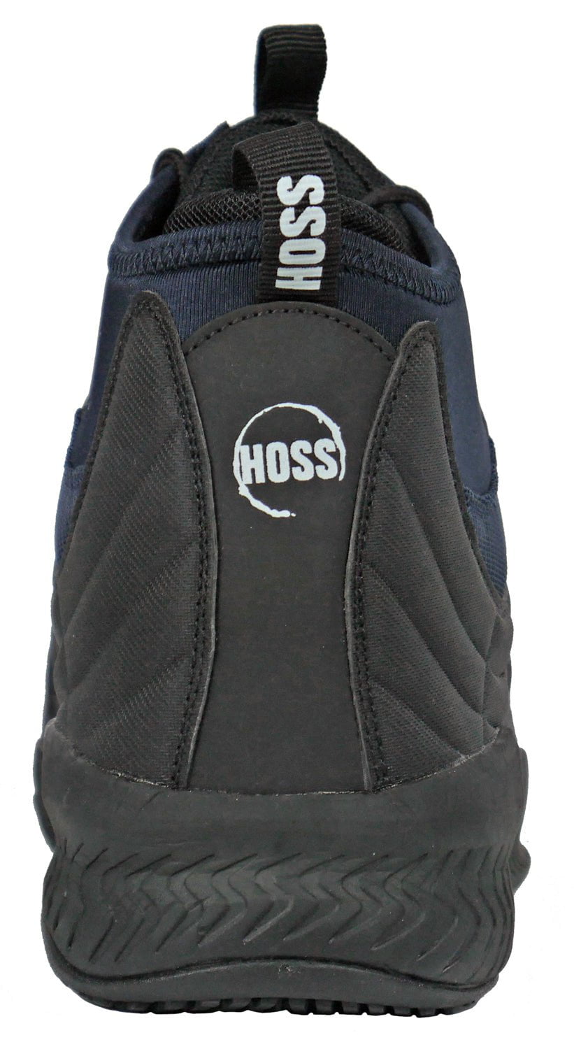 • Black microfiber and navy mesh upper Hoss Boot Company was founded to provide more carefully crafted work footwear choices for hard-working men and women. These men work boots feature black microfiber and navy mesh upper, composite toe, and a slip-resistant rubber outsole. Stay protected and keep working with this great safety footwear!