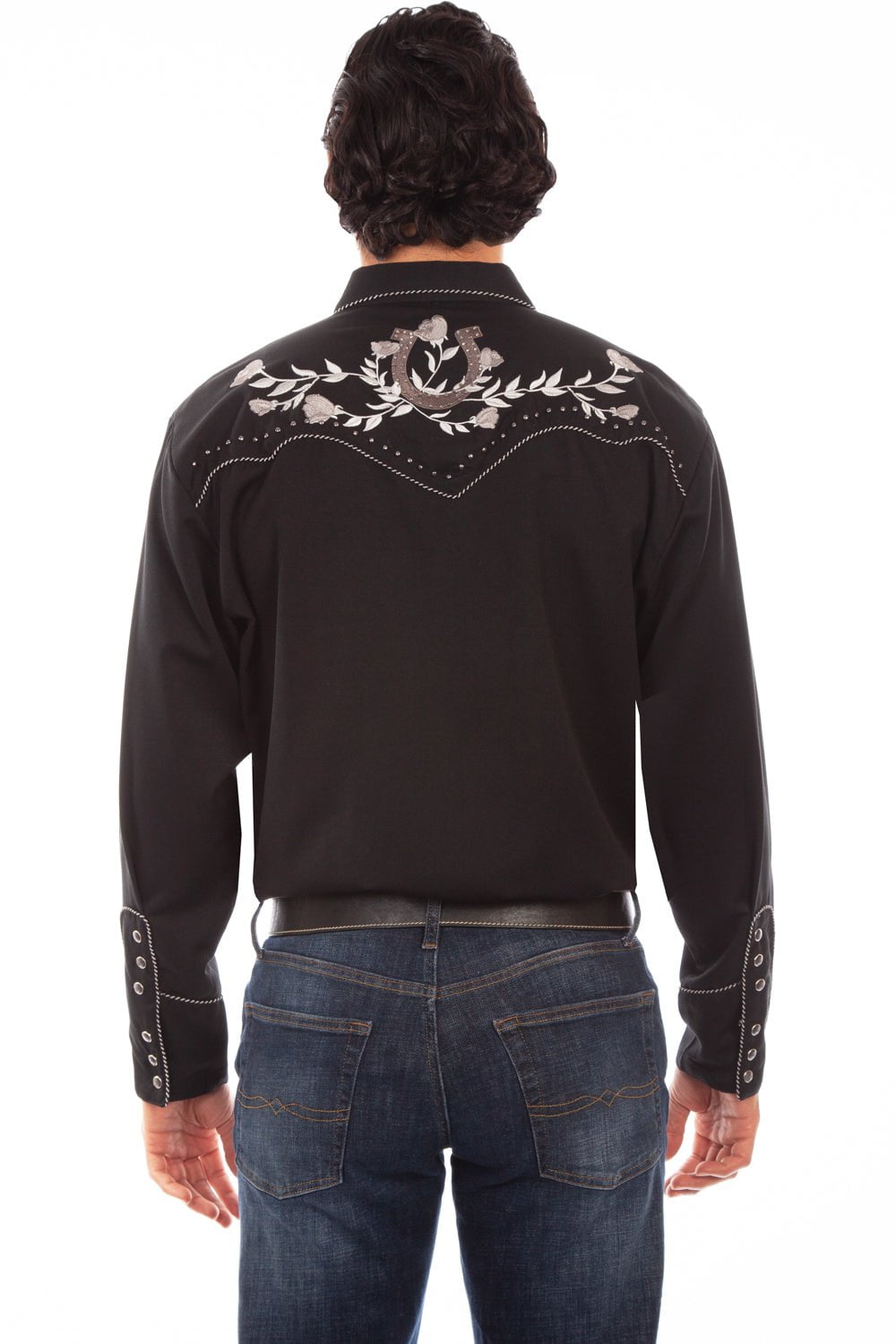 • 65% Polyester/35% Rayon For the best leather accessories, leather goods, and fine western clothing, look no further than Scully Leather. These high quality goods are crafted from the finest materials available. This item features 65% polyester/35% rayon, grey embroidered horseshoe and roses, and studded horseshoe and studs. Enjoy Scully western style in this shirt.